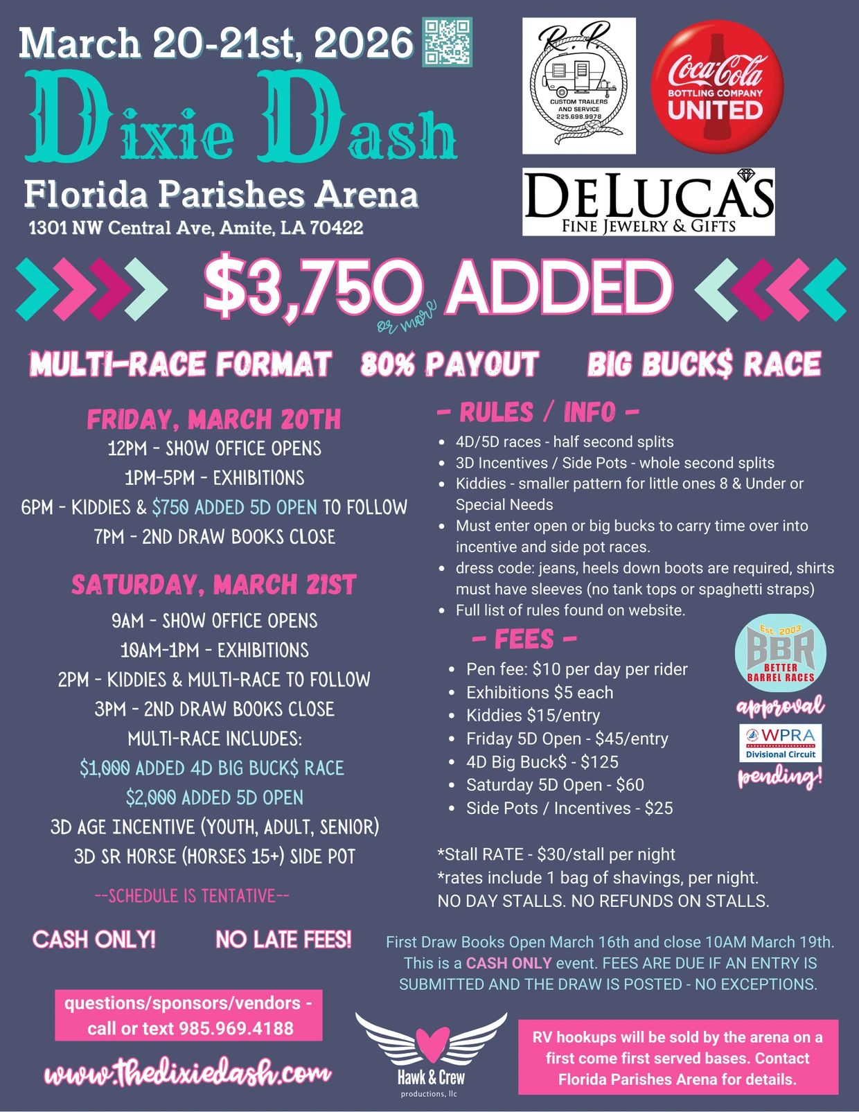 Join us for two thrilling barrel racing days on March 20 & 21, 2026, at the Florida Parishes Arena in Amite, LA!